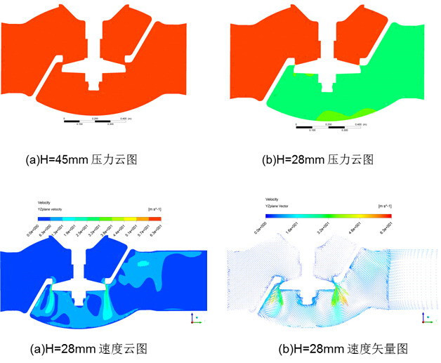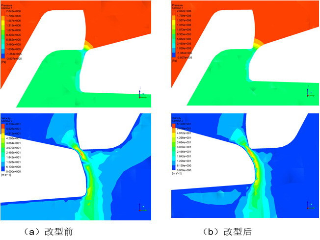 改型前后閥芯與閥座上流區域壓力云圖和下流區域速度云圖